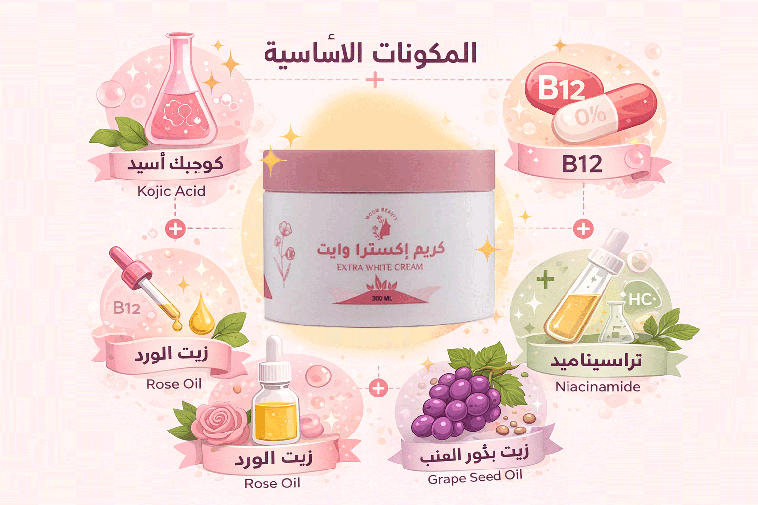 كوجيك أسيد + نياسيناميد + B12 + زيت الورد + زيت بذور العنب